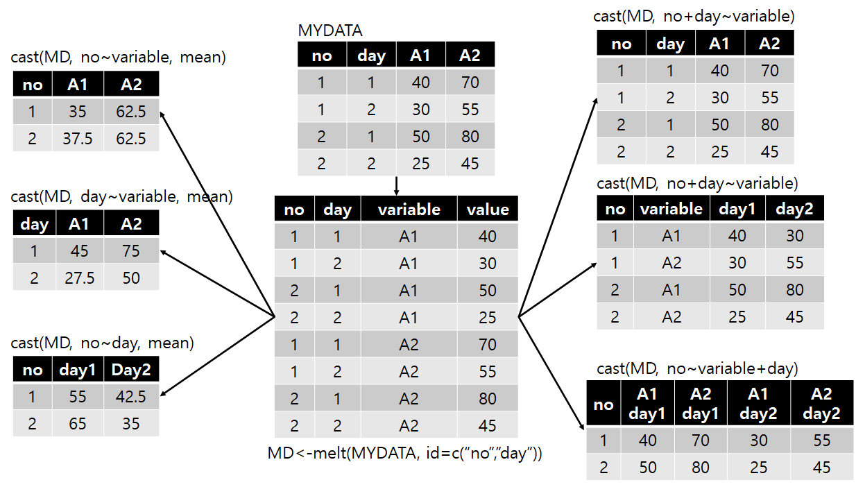 cast(data, fomula= . . . , [func= . . . ]) : 데이터를 fomula에 있는 형태로 변환하고 func 적용