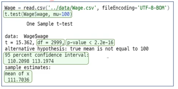 유의 수준 5%에서 평균 wage=100이라는 귀무가설은 기각됨
