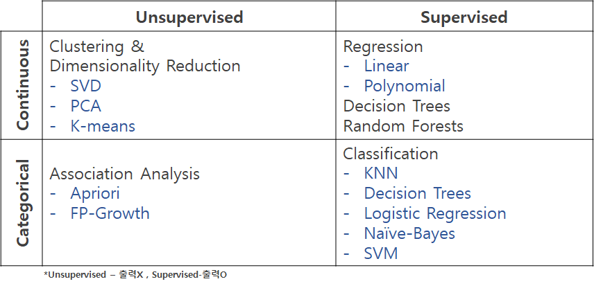 | 종속변수 | 연속형 변수 | 이산형(범주형) 변수 |