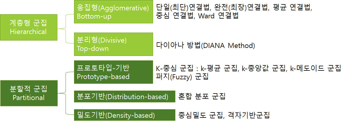 - 유사도 판단은 보통 개체간 거리에 기반(유클리드, 맨해튼, 민코프스키, 마할라노비스)
