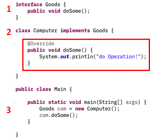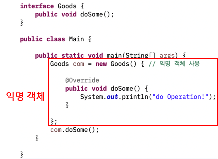 위와 같이 따로 클래스를 만들지 않고, 바로 코드 내에서 익명 객체를 만들어서 사용하기도 했다. 하지만 익명 객체는 재활용이 불가능하므로 Good를 구현한 객체가 자주 사용되어야 한다면, 아래와 같은 코드를 반복해서 사용하게 되고, 그러면 코드가 지저분해진다.
