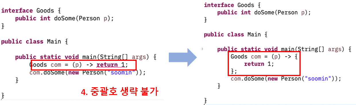 4.함수의 몸체가 하나의 return 문으로만 이루어진 경우, 중괄호를 생략할 수 없다.