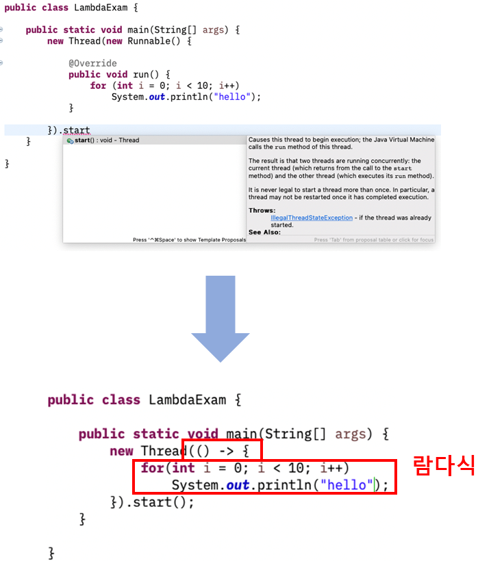 이전에는 Thread class를 생성하기 위해 Runnable interface안에있는 run 메서드가 필요한데, 자바는 메서드만 매개변수로 전달할 방법이 없으므로, 해당 메서드를 가지고 있는 Runnable 객체를 생성해서 전달해야한다. 즉, 자바는 매번 객체를 생성해서 매개변수로 전달 해야한다.