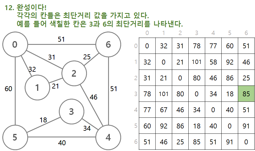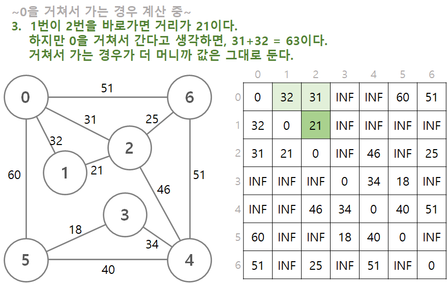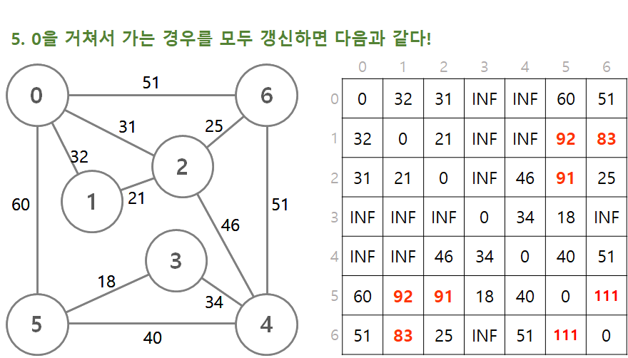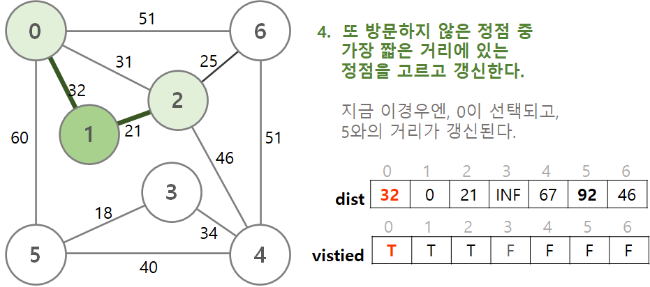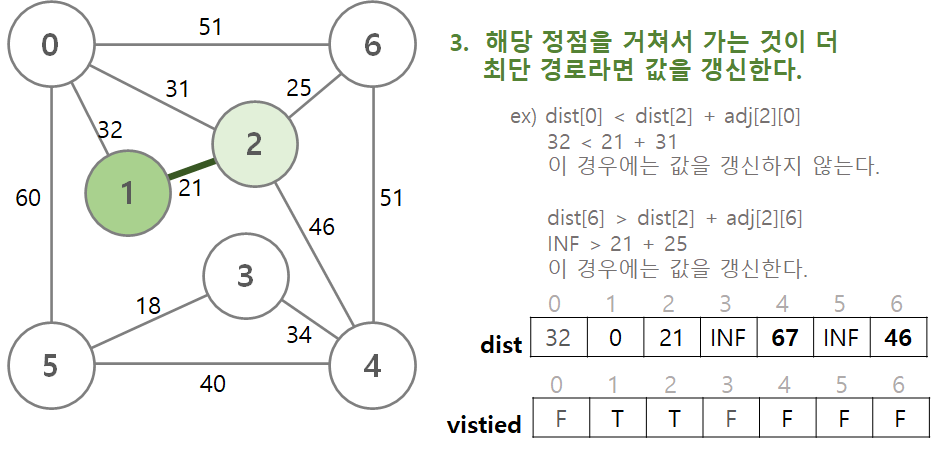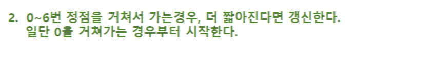 그 다음 부터는 가장 짧은 거리에 있는 정점을 방문하고, 해당 정점을 거쳐가는 거리가 더 짧다면 갱신, 아니면 그대로 둔다.